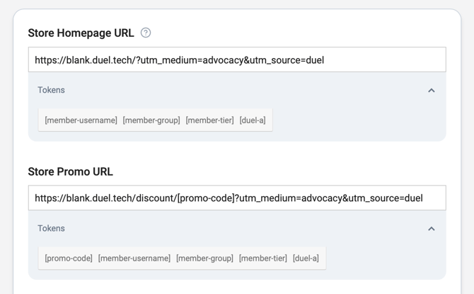 https://www.yourstore.com/?utm_source=duel&utm_medium=advocacy&member=[member-username]&group=[member-group]&tier=[member-tier]&da=[duel-a]