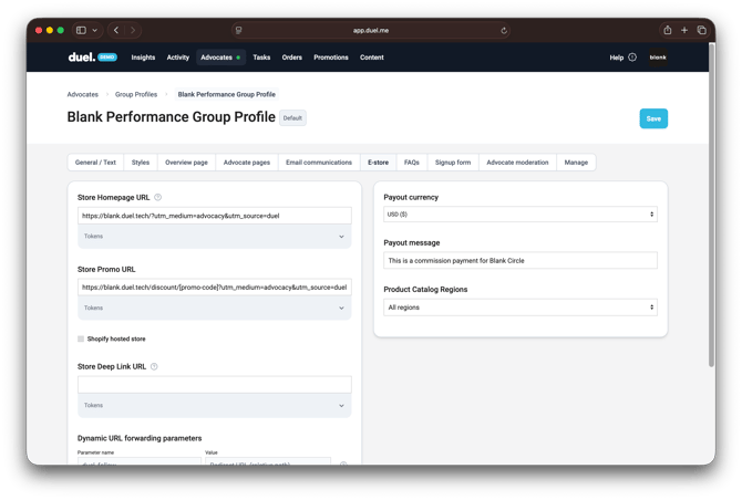 The E-store tab is where you are able to set up the E-store for all relevant groups within the same Group Profile. You will need to set the Store homepage URL, the Payout currency, the Store promo URL (if relevant) and any UTM parameters.