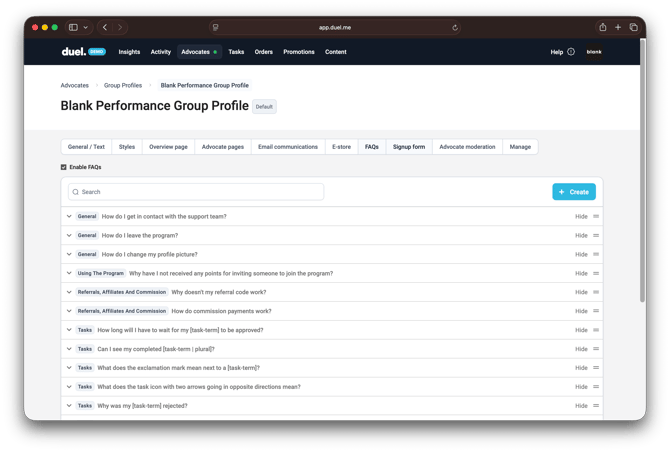 The FAQs tab is the section where you are able to setup, manage and update the frequently asked questions in the programme portals.