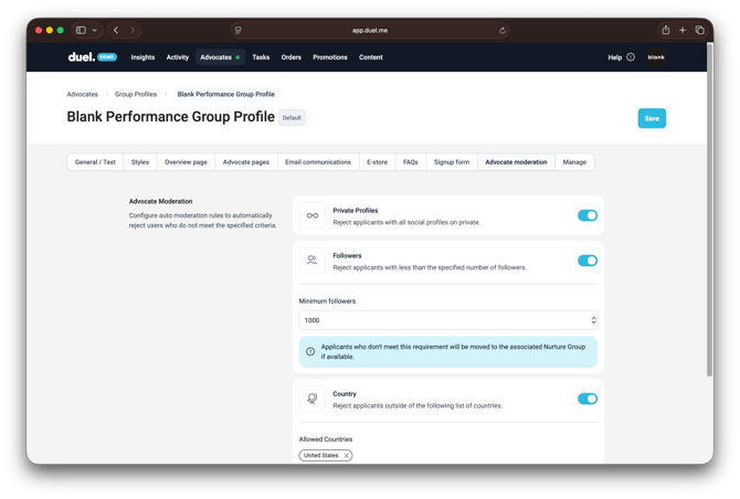 💻 Navigate to Advocates > Group profiles > +Create to add a new group profile