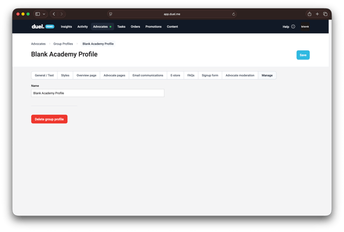 The Manage tab is where you will be able to manage a group profile, such as editing its name or deleting it.