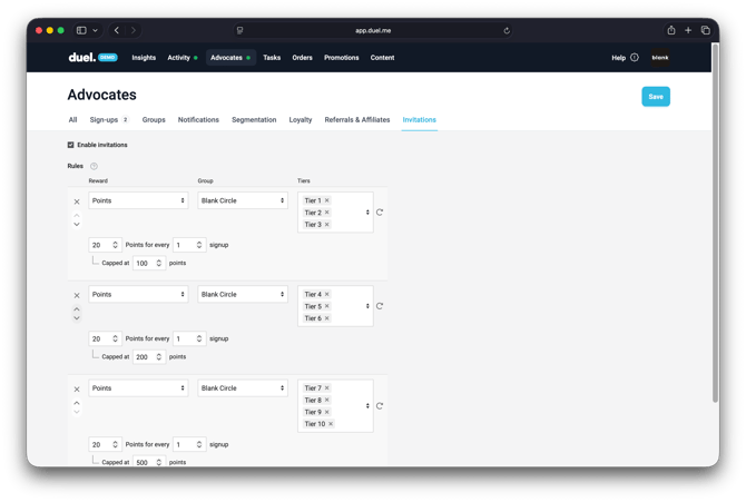 - When setting up rewards for points, you can specify the amount of points that advocates will receive, the number of signups they need to achieve, and if necessary, the maximum number of invitations they can be rewarded for.